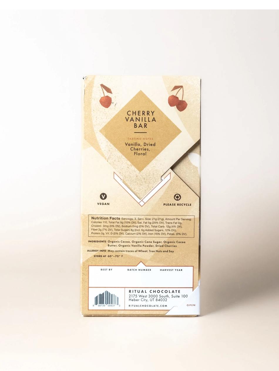 This bar perfectly captures the heavenly pairing of these flavors, reminiscent of childhood summers with vanilla cherry sodas. Ritual source tart Montmorency cherries from Payson Fruit Growers, whose orchards are nourished by winter snow run-off and located just an hour from their factory. With dried cherries sprinkled on top of the 70% vanilla dark chocolate blend, this is a bar that’s hard to put down.