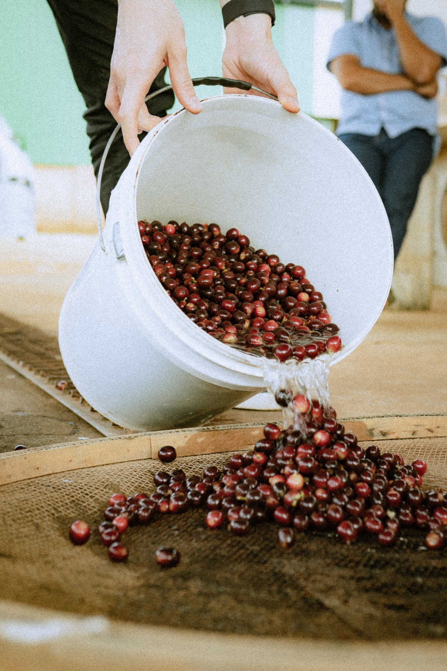 Person pouring red berries from a white bucket onto a wooden surface.